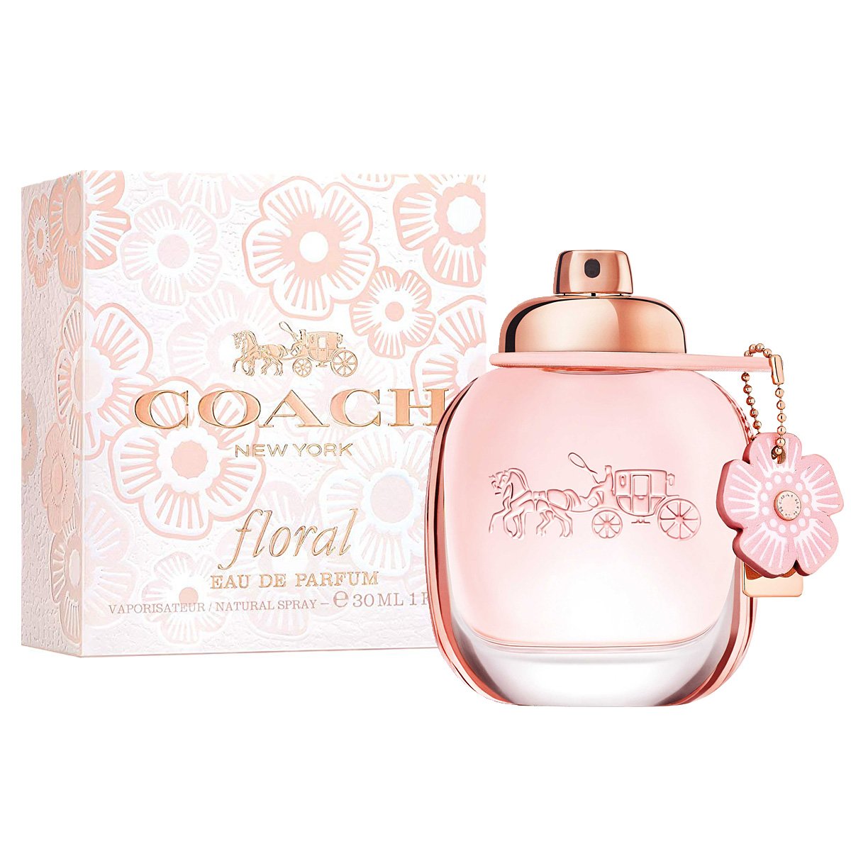Духи заключены во флакон нежно-розового цвета, украшенный подвеской с цветком.