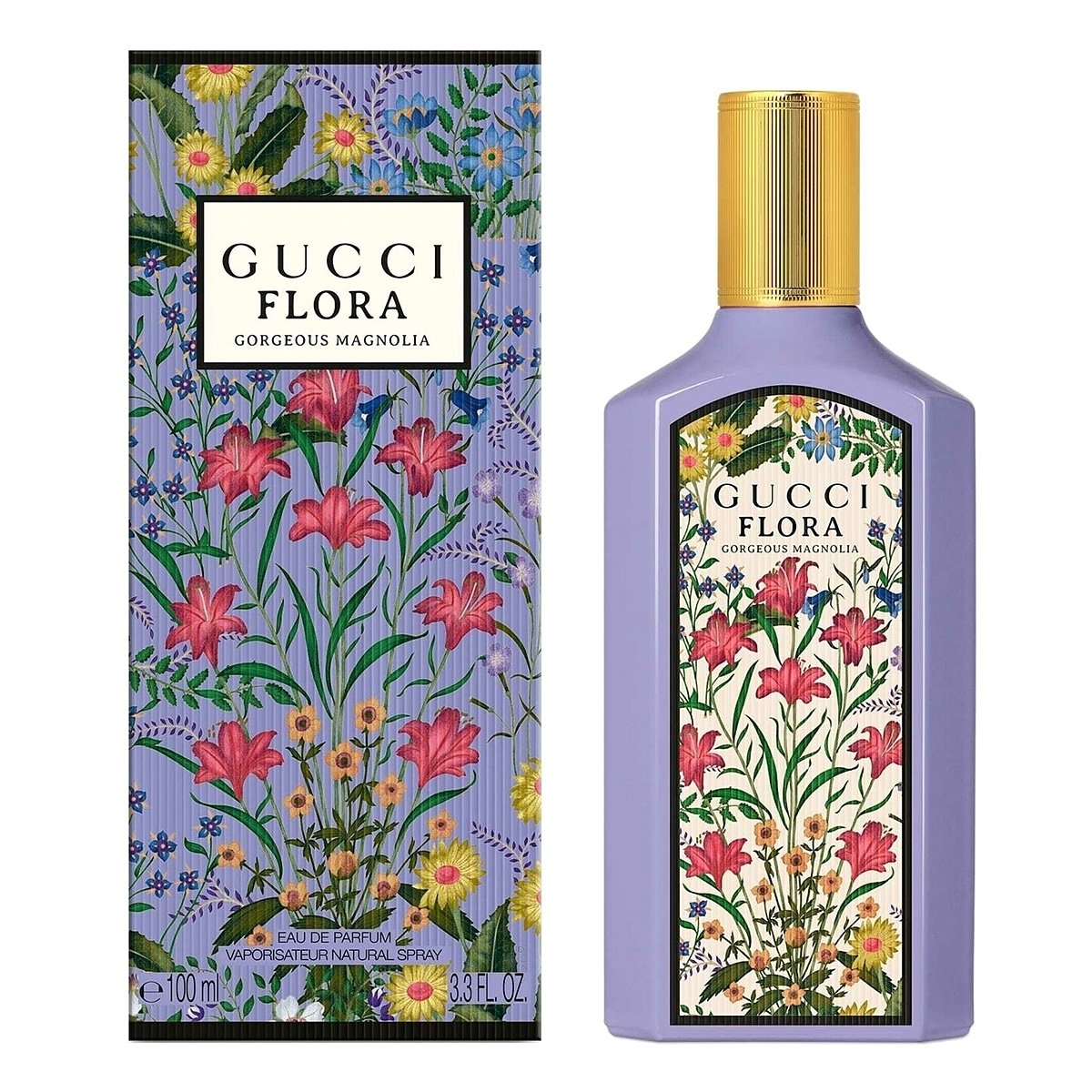 Духи Гуччи Флора Горджес Магнолия заключены в сиреневый флакон из матового лакированного стекла, украшенный культовым цветочным принтом Flora и увенчанный высоким золотистым колпачком.