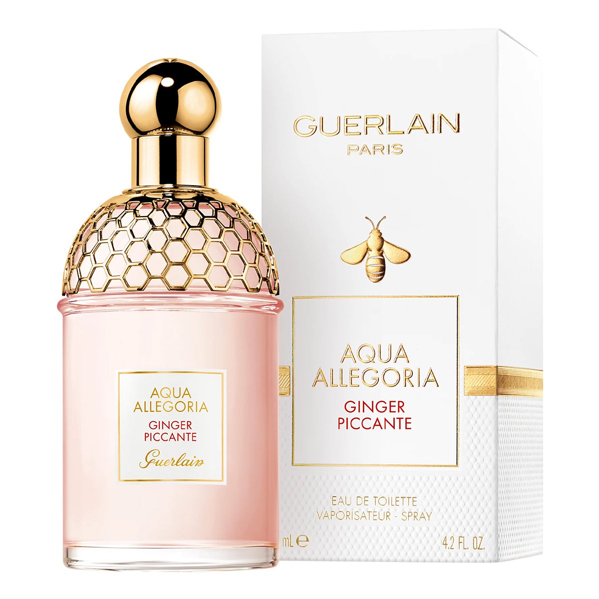 Духи Герлен Гингер Пиканте заключены в узнаваемый розовый флакон, украшенный золотистыми пчелиными сотами и увенчанный округлым золотистым колпачком.