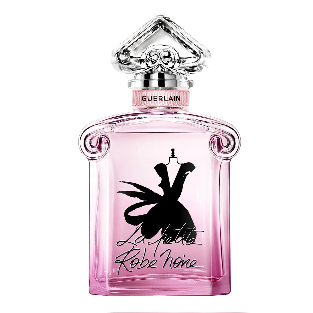 Духи заключены в узнаваемый розово-фиолетовый флакон с изображением изящного черного платья.