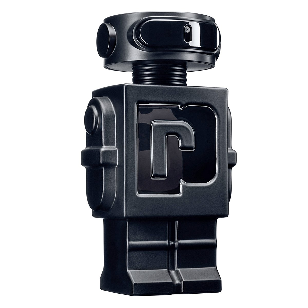 Духи заключены в оригинальный флакон в форме робота матового черного цвета.