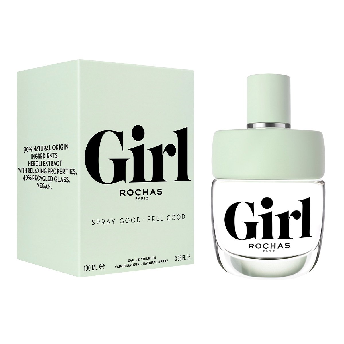 Духи Роша Герл заключены в оригинальный флакон миндально-зеленого цвета, увенчанный колпачком из переработанного пластика. При изготовлении флакона также использовалось вторично переработанное стекло.