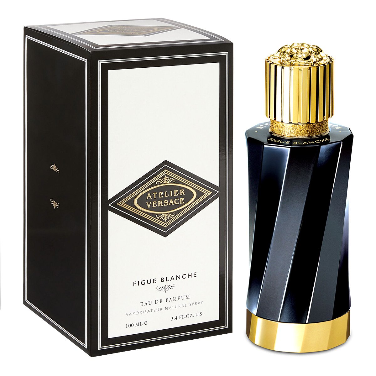 Духи Фигуе Бланш заключены в черный флакон, украшенный золотистой надписью ручной работы с названием аромата. Флакон увенчан тяжелым золотистым колпачком с фирменным рельефным декором в форме головы Медузы Горгоны и упакован в белую коробку с расписанным вручную орнаментом «Греческий ключ». Каждый аромат также комплектуется зеркальцем с золотистым логотипом Atelier Versace.
